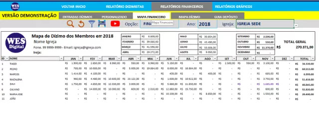 Nesta Planilha de ficha de controle de dízimos e ofertas é feito um controle Geral das entradas de Dízimos e ofertas da Igreja, o mostrando os resultados em Gráficos e Relatórios personalizados, abaixo uma amostra dos gráficos gerados apos os lançamentos. Deixei um vídeo no final pra você ver alguns Recursos que fiz na apresentação da Planilha.